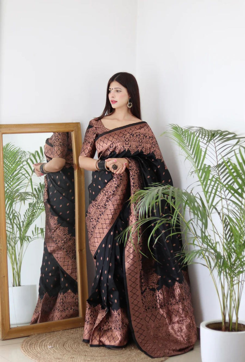 Embrace timeless elegance with this stunning Pure Silk Banarasi Saree in a classic Black shade....