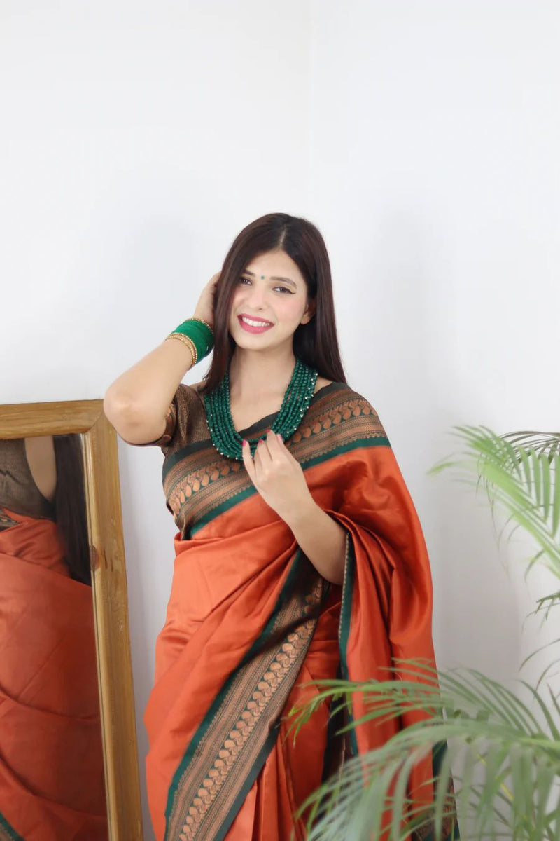 Orange Banarasi Soft Silk Saree with Zari Weaving & Matching Blouse