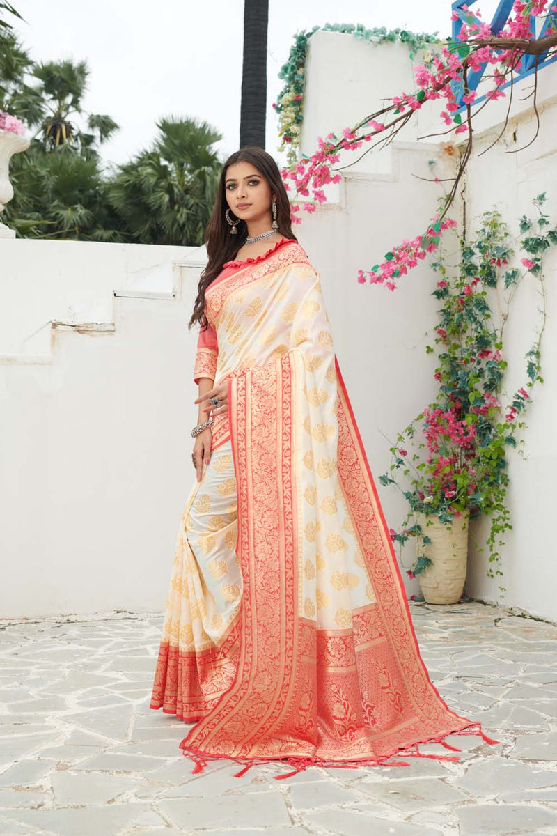 Elevate your ethnic wardrobe with this Jasmin White and Red Zari Woven Banarasi Silk Saree....