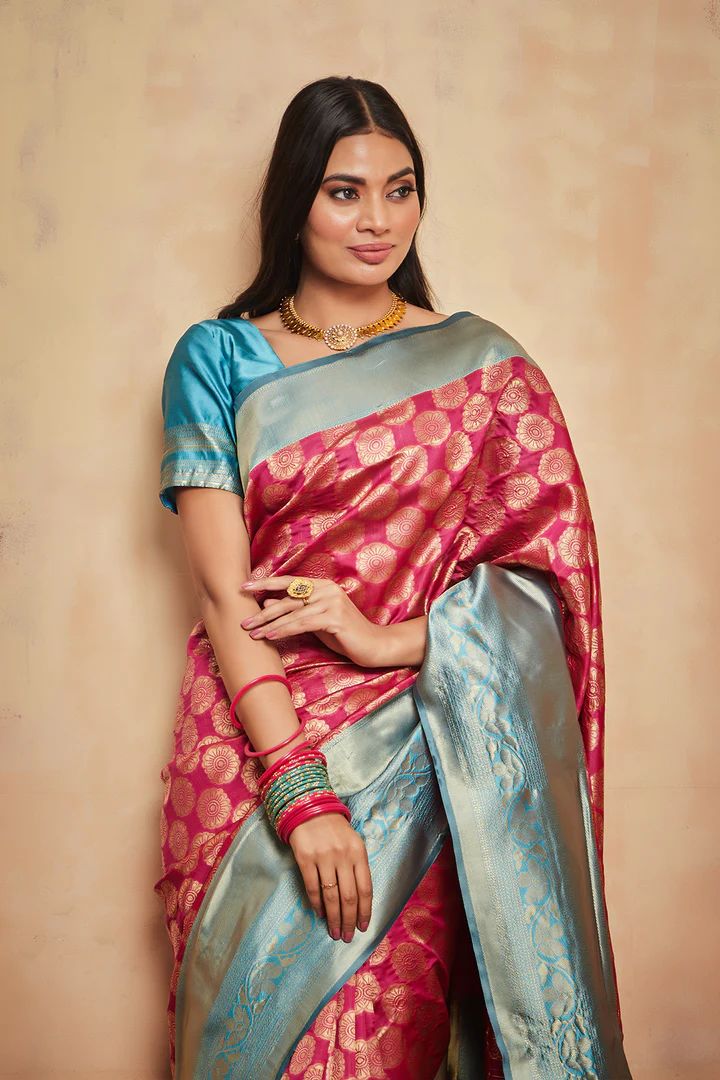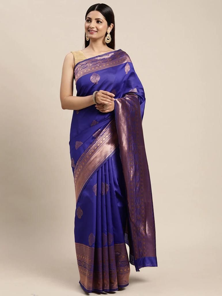 Enhance your ethnic wardrobe with this elegant Blue Banarasi Silk Saree, showcasing the timeless charm...