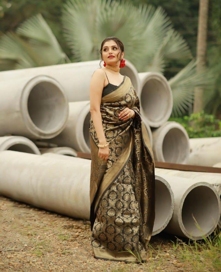 Banarasi Silk Saree with Intricate Zari Work, Unstitched Blouse Piece, Festive & Wedding Wear (Black)
