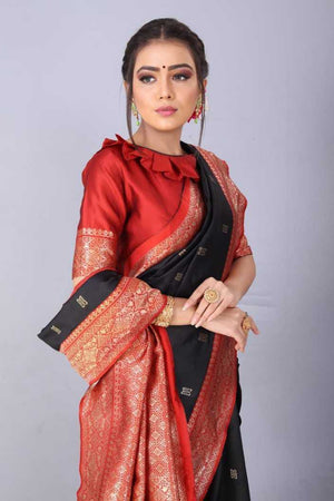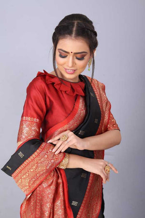 Made from fine silk blend fabric, it offers a luxurious texture and graceful drape. The golden zari patterns on a black base highlight traditional artistry, while the unstitched blouse piece allows you to personalize your look. Whether it's a grand event or a cultural celebration, this regular-style saree will ensure you stand out with elegance.