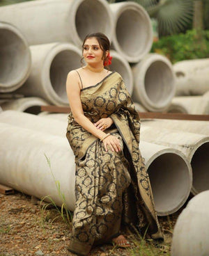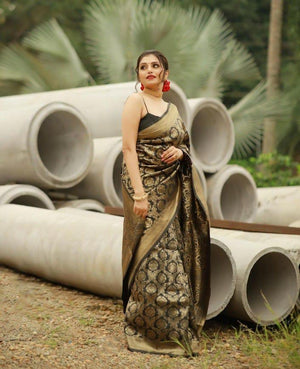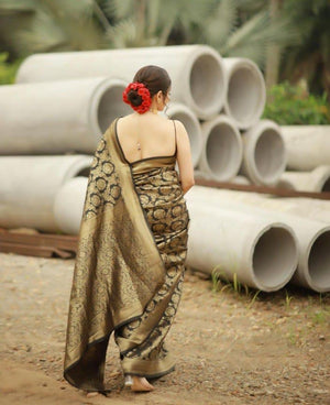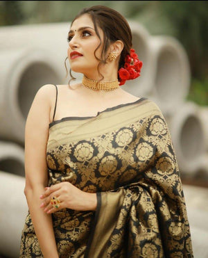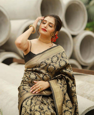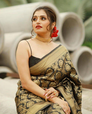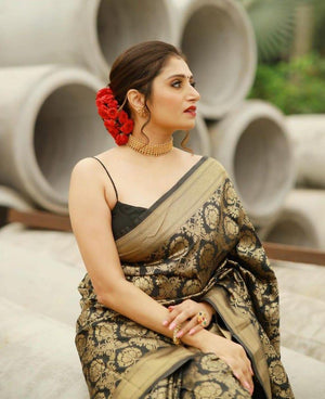 Add timeless charm to your ethnic collection with this exquisite Banarasi Silk Saree in elegant Black. Highlighting traditional Indian artistry, it features rich and intricate zari work that reflects the opulence of Banarasi weaving. Perfect for weddings, festive occasions, and grand celebrations, this saree effortlessly elevates your style with regal grace.