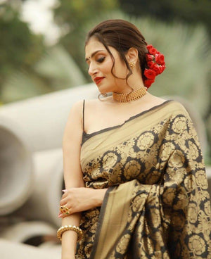 Banarasi Silk Saree with Intricate Zari Work, Unstitched Blouse Piece, Festive & Wedding Wear (Black)