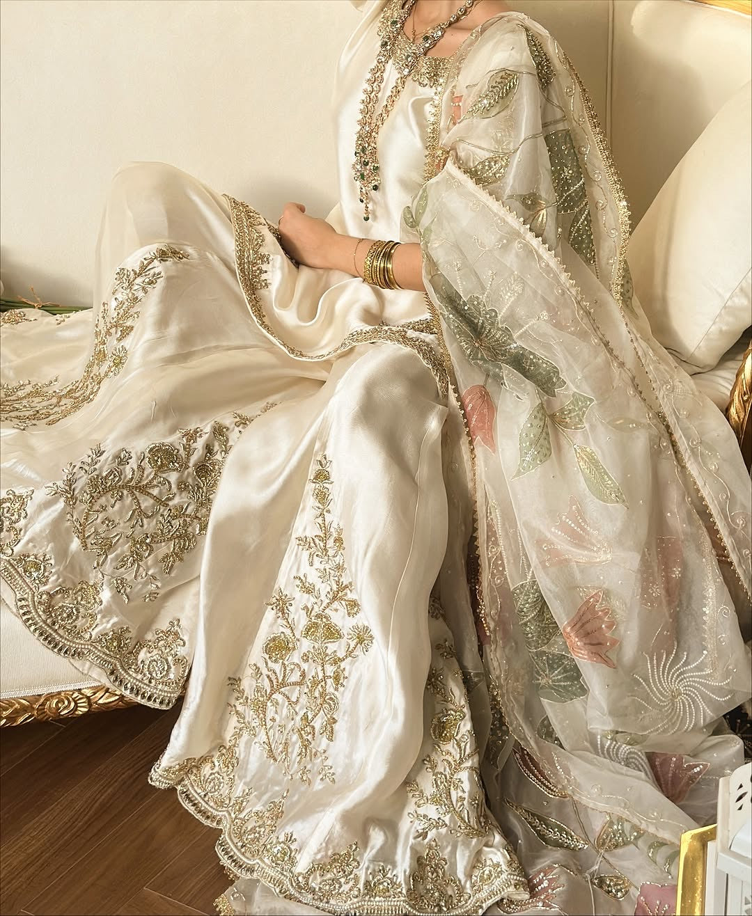 ✅ The dupatta is crafted from printed organza, finished with sequin embroidery and lace border.