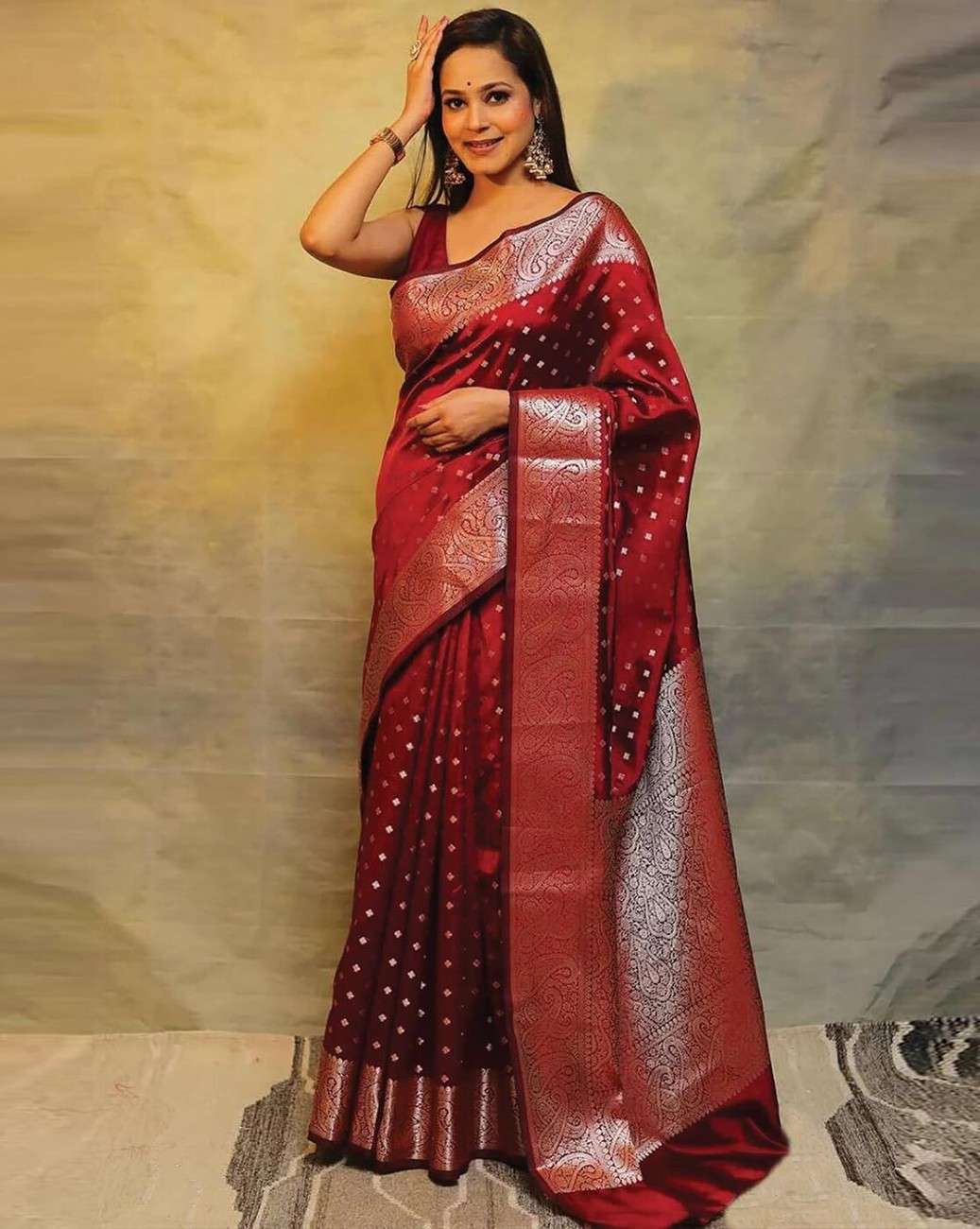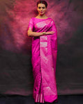 Crafted from a premium silk blend, the saree drapes gracefully, while the zari border and subtle embellishments enhance its luxurious appeal. Complete with an unstitched blouse piece, it offers versatility for custom tailoring to suit your unique style.