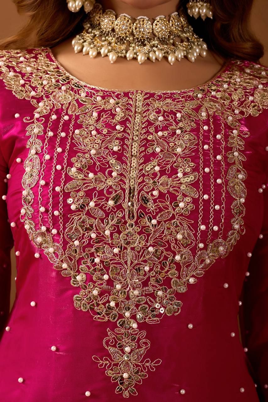 This fully stitched 3-piece outfit features a graceful full-sleeve top, richly embroidered plazzo, and a beautifully bordered dupatta — giving you the perfect premium party wear look with minimal effort.