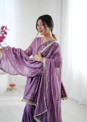 Step into elegance with this beautifully crafted Mal Chanderi 3-piece ethnic set, designed with real mirror handwork for a premium festive look. This ready-to-wear kurti, sharara plazzo, and dupatta set offers luxurious shine, soft comfort, and graceful silhouette — perfect for festive functions, weddings, parties, and traditional celebrations.