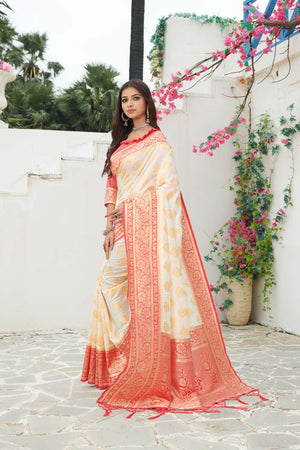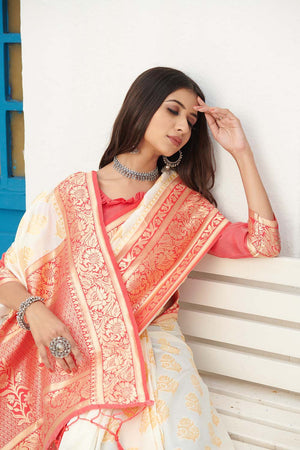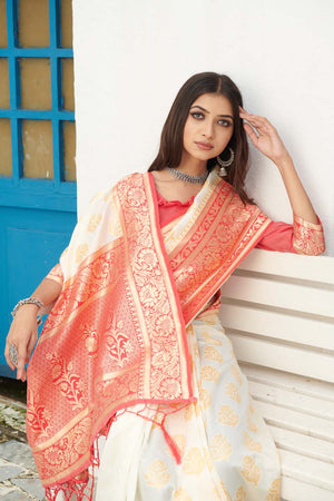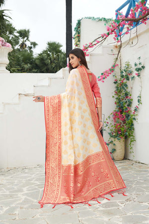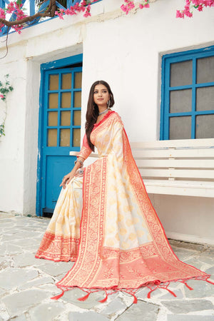 Elevate your ethnic wardrobe with this Jasmin White and Red Zari Woven Banarasi Silk Saree. Crafted from pure Banarasi silk, this elegant saree features intricate all-over zari weaving and comes with a matching red blouse that complements the border perfectly. Ideal for weddings, festivals, and traditional events, this saree blends classic craftsmanship with timeless beauty.