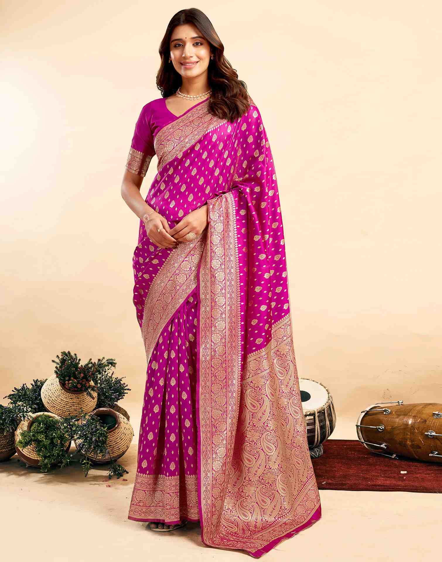 Add a regal charm to your ethnic collection with this Woven Design Zari Silk Blend Banarasi Saree, available in gorgeous shades of Pink, Rama, and Wine. Crafted with intricate zari weaving, this saree showcases the traditional artistry of Banaras, making it perfect for weddings, festive gatherings, and cultural celebrations.