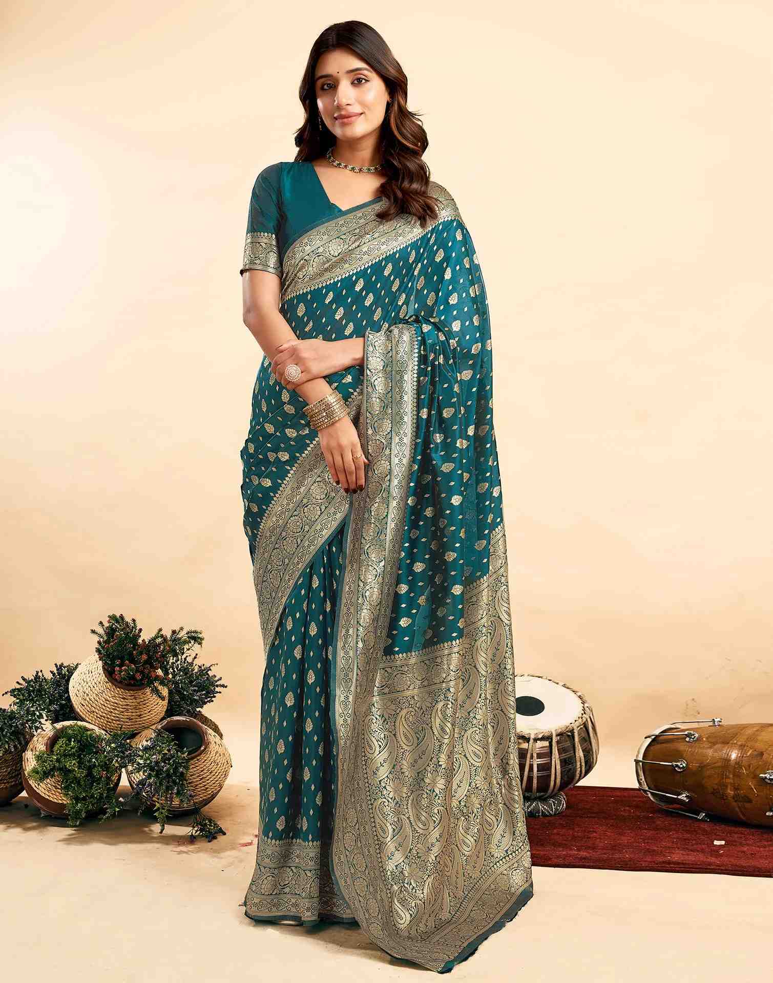 The soft silk blend fabric ensures a graceful drape and long-lasting comfort, while the woven zari patterns enhance its luxurious appeal. Paired with an unstitched blouse piece, this saree is a versatile choice for women who love traditional elegance with a touch of modern grace.